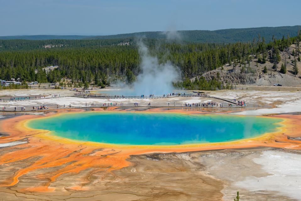 The terraces were both white and pink colored due to their specific mineralogy and bacterial colonies. The pink hue in some of the terraces is believed to be due to pink colored bacteria that thrive in hot mineral rich water. A modern-day analogue is Yellowstone's Grand Prismatic Spring, which ranges from blue to green to red.